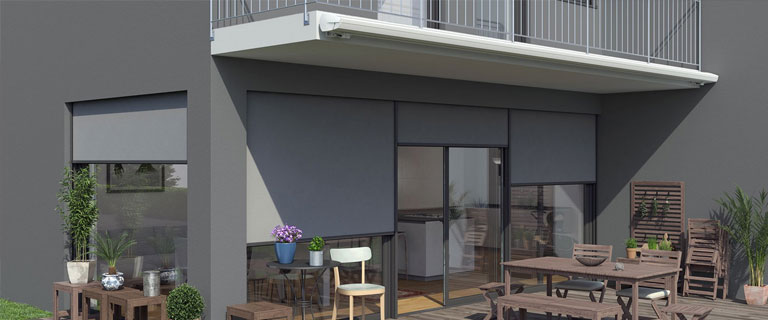 Die Senkrechtmarkise schützt wirksam vor tiefstehender Sonne. Dabei sorgen die Zip-Screen-Stoffe dafür, dass das Tageslicht nicht komplett ausgeschlossen wird. Mit klaren Linien und schlanker Bauweise fügt sie sich dezent an Fenster, Wintergarten und Terrasse ein.